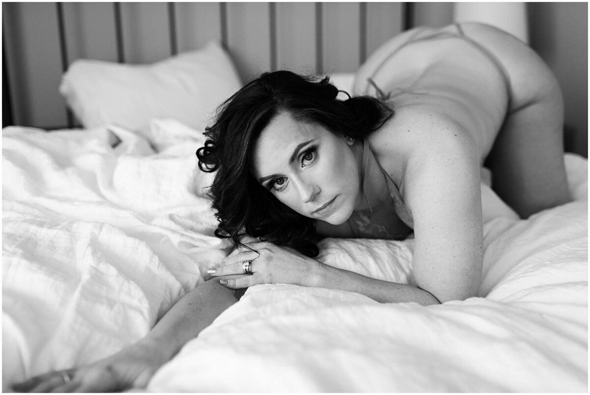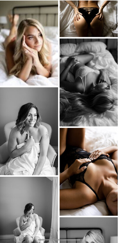 I most often take these in my home, but can also come to your home or book a hotel room for a different look! I typically use a guest room in our home, plus a few other little spots that offer some different lighting and posing opportunities. The image on the right was actually taken in my basement! I know, I know - "come over to my house and take pictures in my basement..." might be one of the creepiest things you could hear, but trust me! Basement photos are moodier and gals tend to feel a bit more open to being more risque as it's a darker environment that we typically save for last!